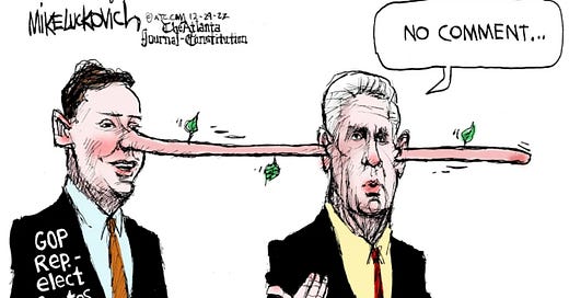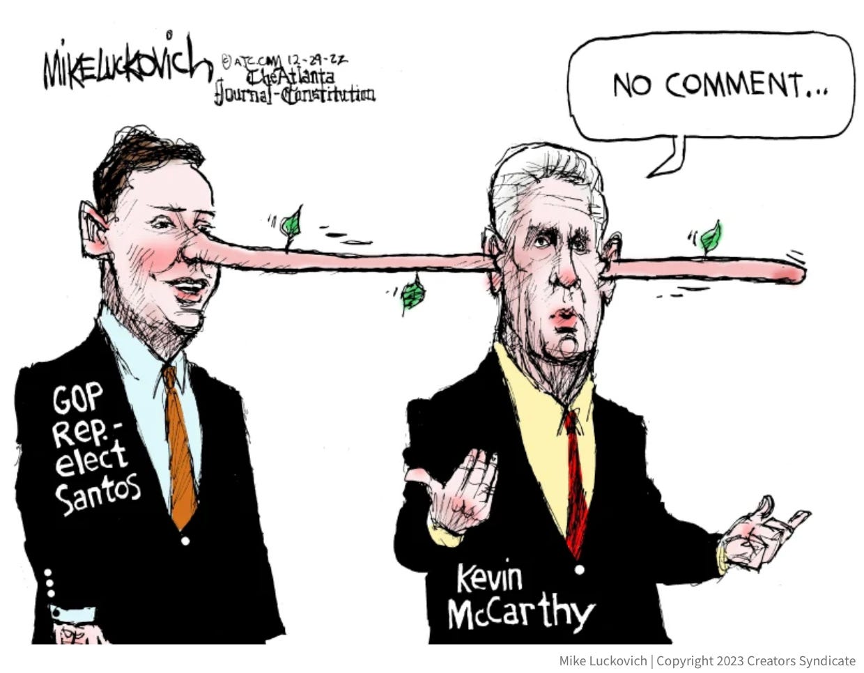 Could George Santos actually shoot someone on 5th Avenue and not lose any votes? If we’re talking about votes of support from fellow Republicans in Congress, the answer appears to be a resounding yes! Apparently, lying about pretty much everything regarding who he is and what he’s done, is not enough for Santos to lose any Congressional votes from his party. What’s worse, it turns out that during his campaign for a House seat last year, he actually and consciously tailored his lies to appeal not only to his right-wing base; he simultaneously crafted a completely separate set of lies that would appeal to Independents and Democrats as well. The Machiavellian strategy worked, and now that he’s been elected, based on all those lies, the MAGA controlled Republicans refuse to hold him accountable for any of it (they need every single vote to continue their assault on democracy, so there!). Yes, he probably could shoot someone in plain view on 5th Avenue. Based on MAGA mouthpiece Kevin McCarthy’s comments this past week, he would have to end up in prison to lose his seat alongside his fellow fascists. Thank you Donald Duck-the-Law, for showing them how it’s done.