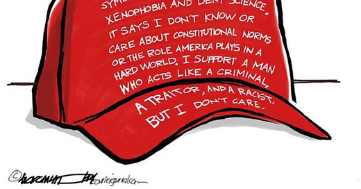 Here are some relevant polling results (putting aside the outsize and caustic role that polls have in our political system). Polls consistently report that roughly 45% of registered Republicans will stand by Trump no matter what he does or says, even if he is breaking the law, lying, and/or hurting people (the classic “end justifies the means”).